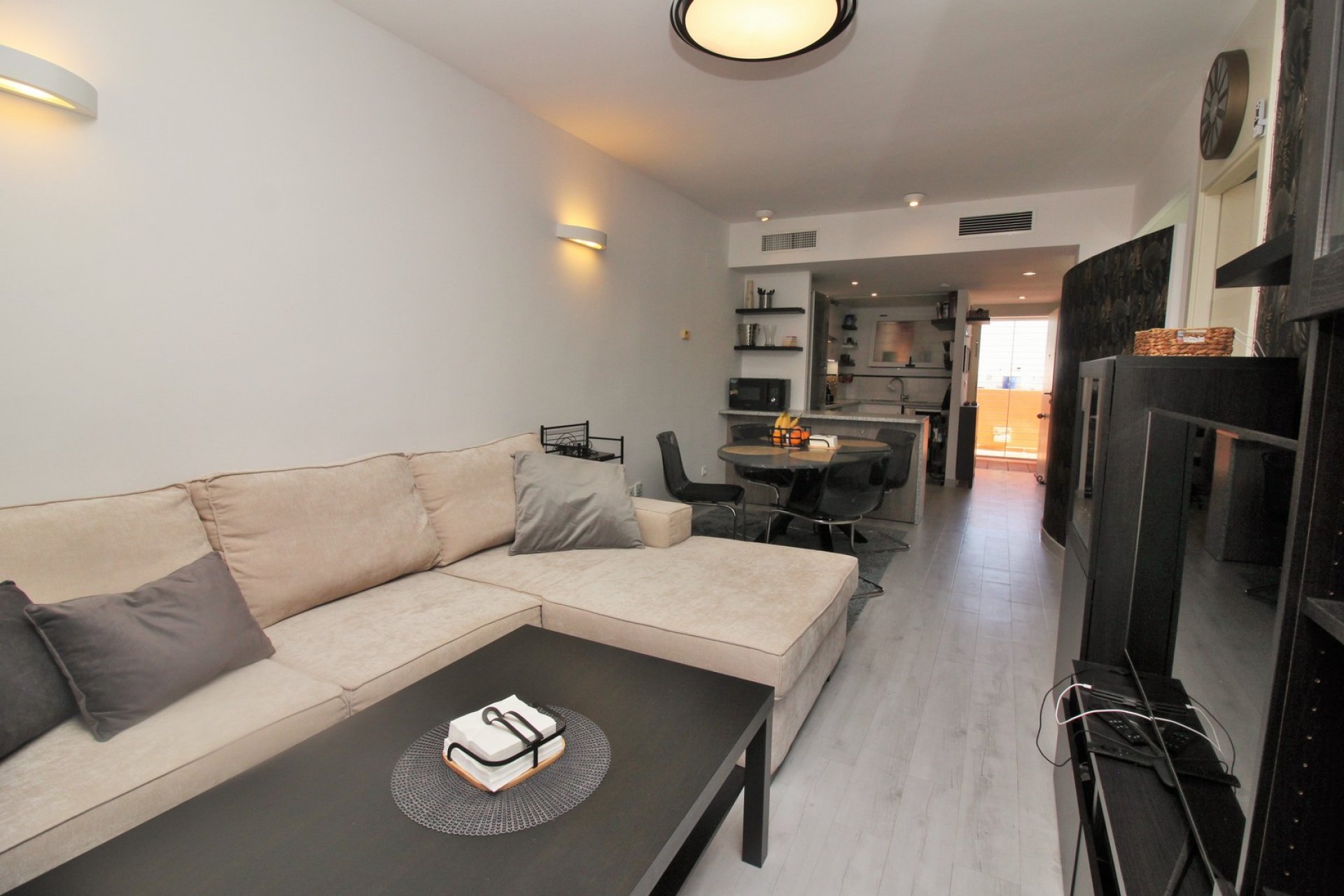 Beautiful 2 bedroom, 2 bathroom penthouse apartment (lifts available) with private roof solarium directly overlooking the pool for sale in El Rincon. The apartment has received an updated interior, and comprises of a bright lounge-dining area with patio doors leading onto the sunny balcony with pool and garden views, open plan kitchen with breakfast bar, 2 bedrooms with fitted wardrobes and 2 bathrooms with underfloor heating plus storage/utility room. The master bedroom offers its own en-suite bathroom with walk-in shower, plus access to the front balcony. A unique feature of this particular apartment is that the 2nd bathroom is not en-suite, so can be used as a guest bathroom for visitors without having to go into the twin bedroom. External stairs leads to a large private roof terrace with sea and pool views, and offers plenty of space to sunbathe and entertain on. Also included is ducted air-conditioning in all rooms, secure off-road parking space and the use of 2 communal pools and well maintained garden areas. The entire exterior of the complex has been recently repainted. The current owners have done additional upgrades to the apartment including new flooring throughout, new walk-in shower, lighting, furniture, and appliances (Haier) which are just 4 months old. Located just a few hundred metres from 3 supermarkets, the Playa Flamenca and Citrus commercial centres, which hosts a vast array of bars, shops and restaurants. The Playa Flamenca beach is only a few minutes drive away including the Zenia Boulevard shopping mall. Due its location and proximity to a wide range of amenities, apartments in El Rincon are a good rental opportunity or make the perfect holiday home with well kept communal areas and the use of 2 beautiful pools.